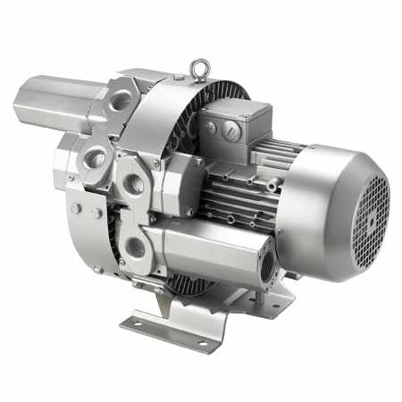 工作原理:葉輪轉動時,由于離心力的作用,風向標促使氣體向前向外運動,從而形成一系列螺旋狀的運動。葉輪刀片之間的空氣呈螺旋狀加速旋轉并將泵體之外的氣體擠入(由吸氣口吸入)側槽,當它進入側通道以后,氣體被壓縮,然后又回復到葉輪刀片間再次加速旋轉。當空氣沿著一條螺旋形軌道穿過葉輪和側槽時,每個葉輪片增加了壓縮和加速的程度,隨著旋轉的進行,氣體的動能增加,使得沿側通道通過的氣體壓力進一步增加。當空氣到達側槽與排放法蘭的連接點,氣體即被擠出葉片并通過出口消聲器排出泵體。